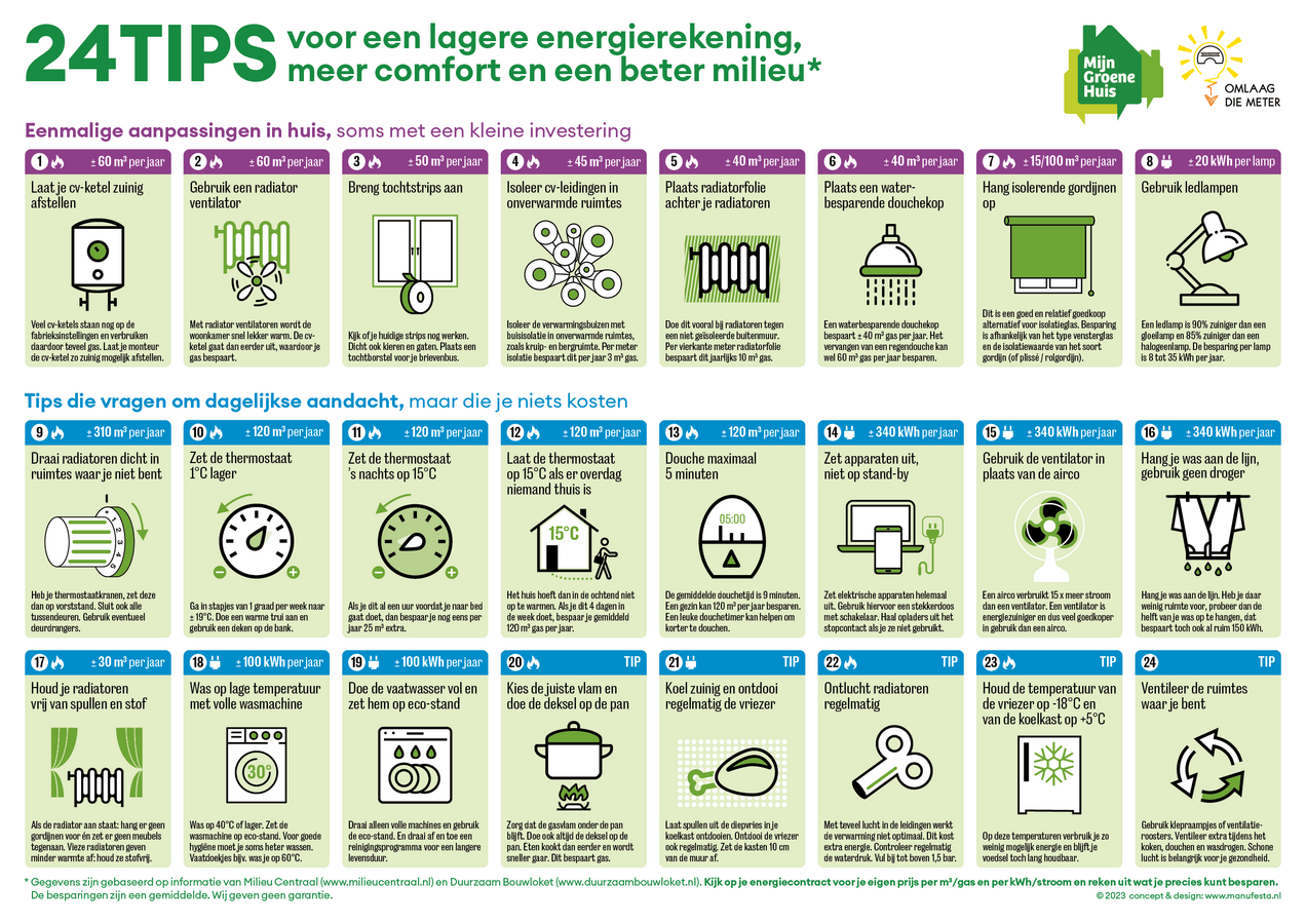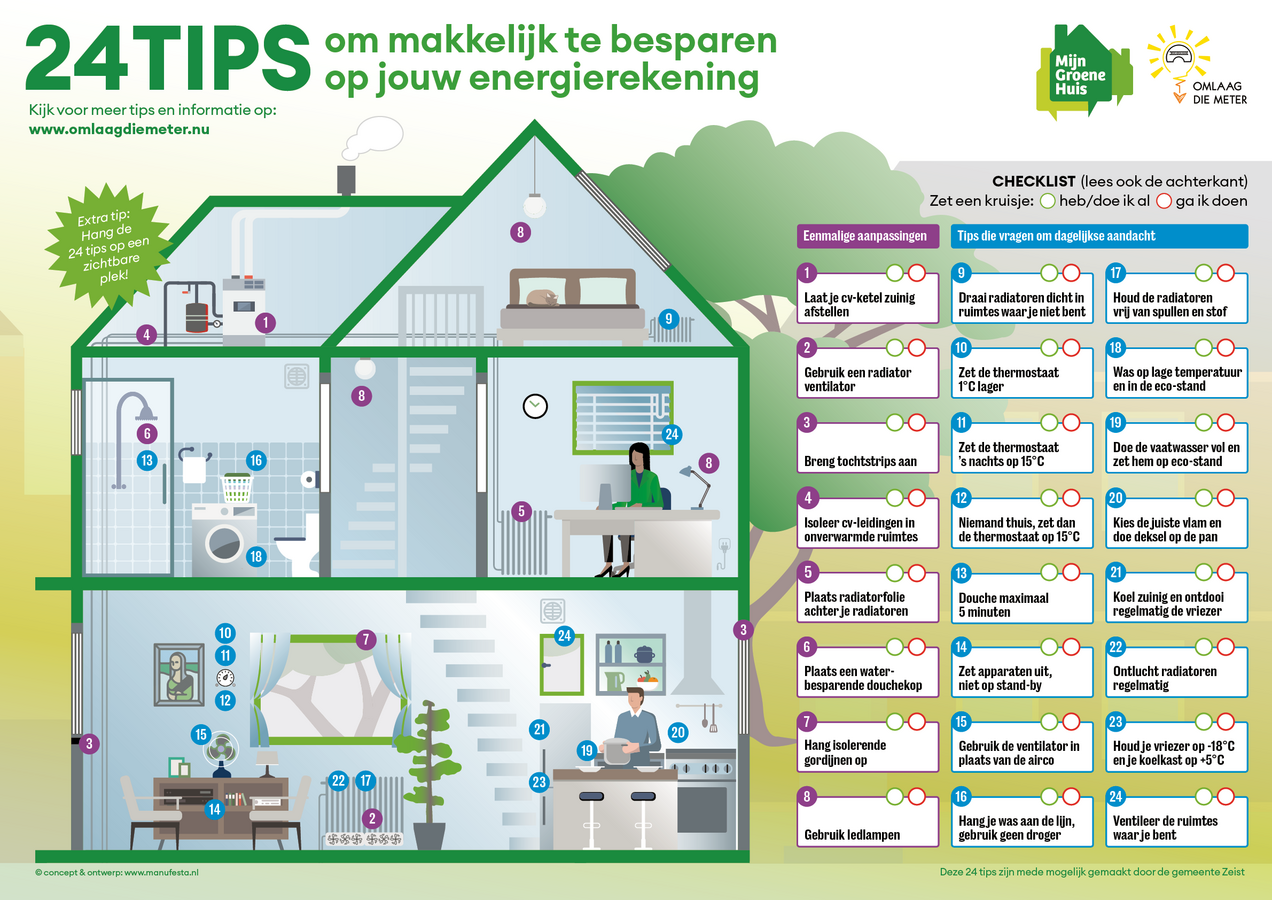 Je kunt als huurder veel geld besparen én tegelijkertijd een belangrijke bijdrage leveren aan het milieu. Hieronder staat een poster van de Zeister organisatie 'Mijn Groene Huis' met 24 tips. Je kunt deze tips eenvoudig en snel invoeren. En alles bij elkaar scheelt het heel wat op je energierekening! Kijk voor meer bespaartips en informatie op de website van Mijn Groene Huis of BENG De Bilt.
