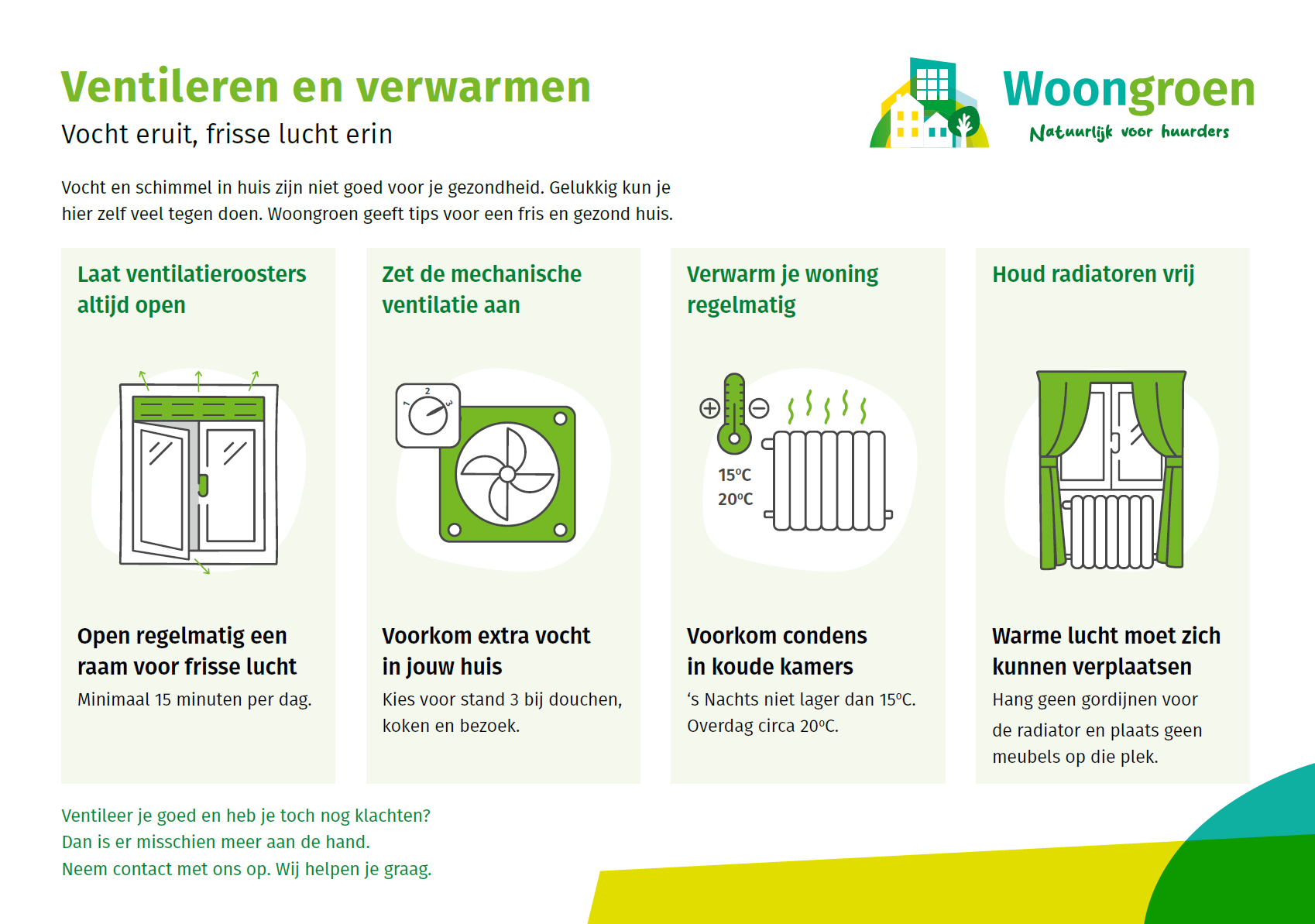 Echt niet elk raam hoeft de hele dag open te staan, maar een ruimte moet nooit helemaal potdicht zijn. Ventileer vooral na het koken, douchen en slapen. Alleen luchten (zoals de ramen korte tijd open zetten) is niet genoeg. Na een half uurtje is de frisse lucht namelijk verdwenen en hopen vocht en stoffen zich weer op in de woning. Is jouw woning goed geïsoleerd? Ook dan is het extra belangrijk om goed te ventileren.